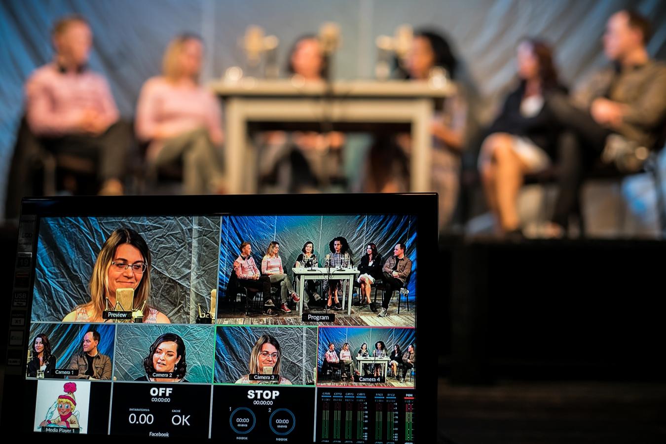 Akordeonista Jaroslav Jurečka, překladatelka hry Karolína Stehlíková, dramaturgyně cyklu Anna Hlaváčková, režisérka Aminata Keita a herci Veronika Malá s Josefem Láskou v den online premiéry na Malé scéně, foto Jiří Sejkora