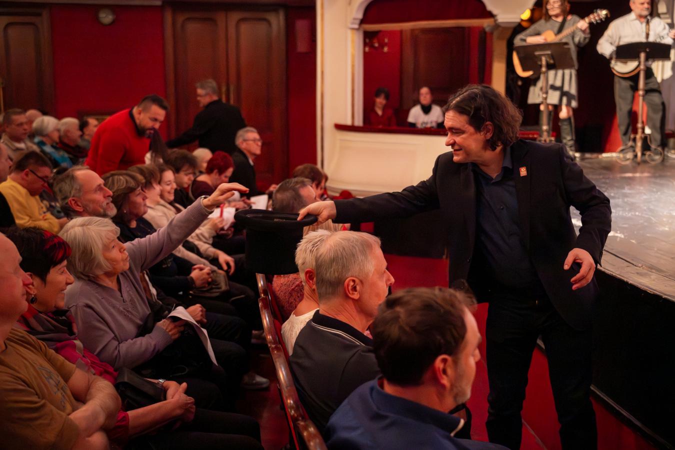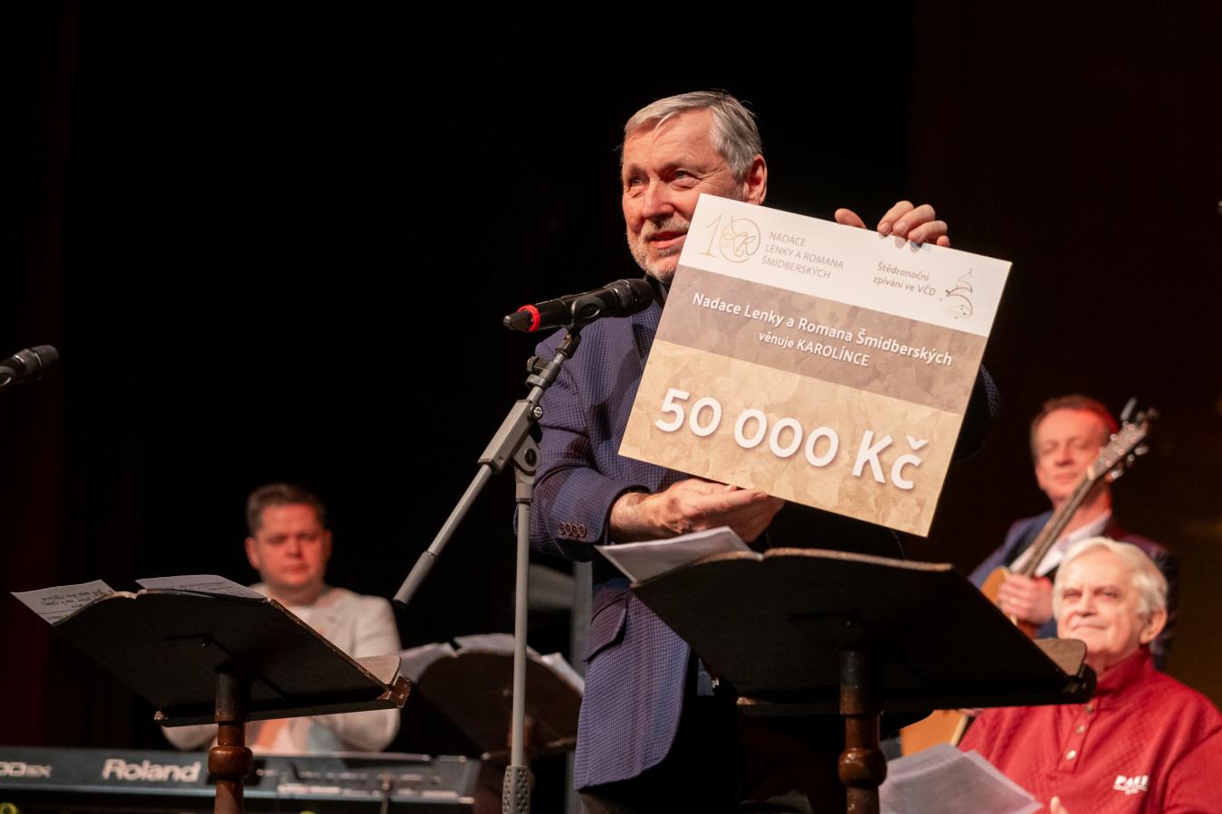 Ředitel divadla Petr Dohnal s šekem Nadace Lenky a Romana Šmidberských pro nemocnou Karolínu Horvátovou, foto Petr Šedivý