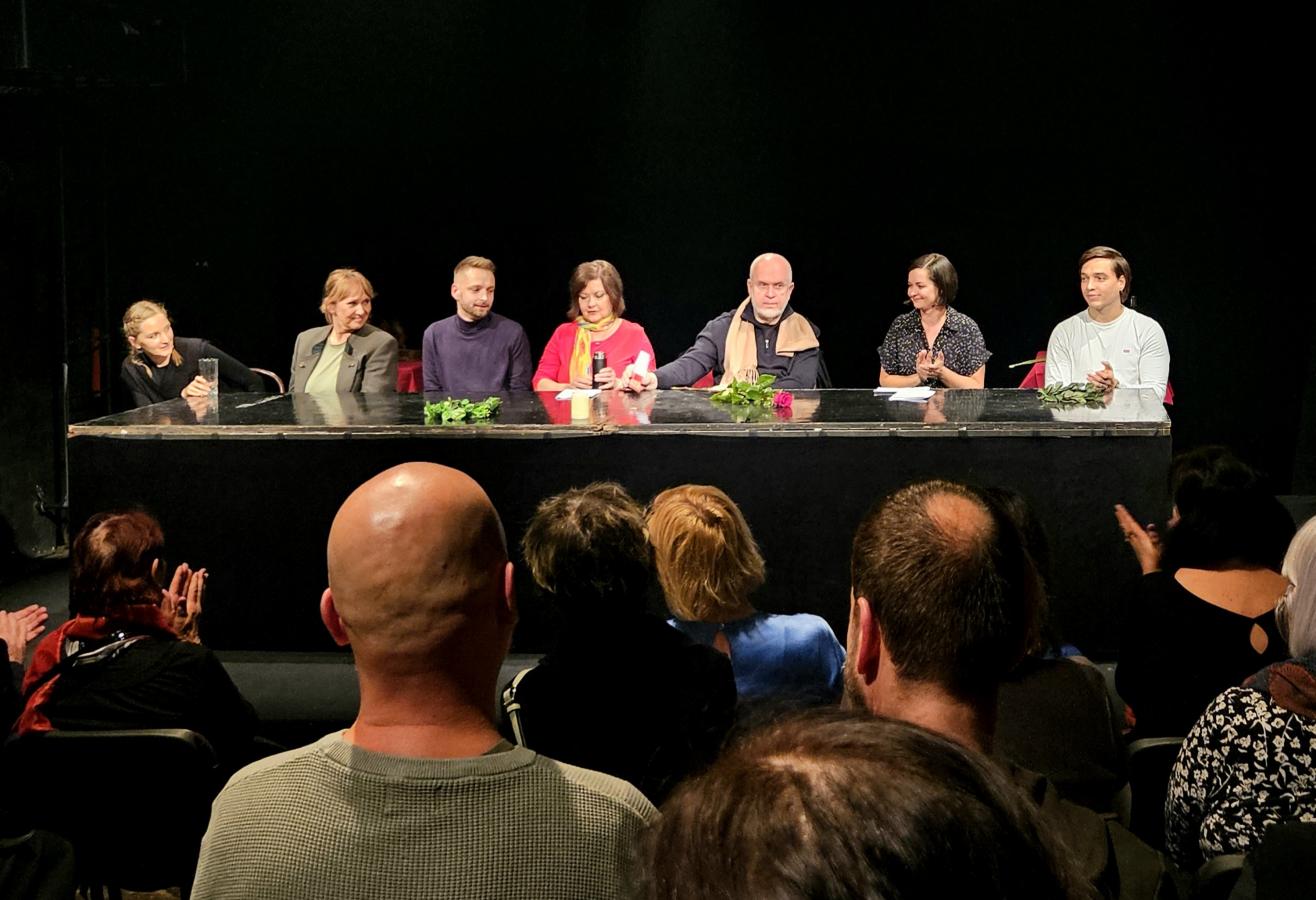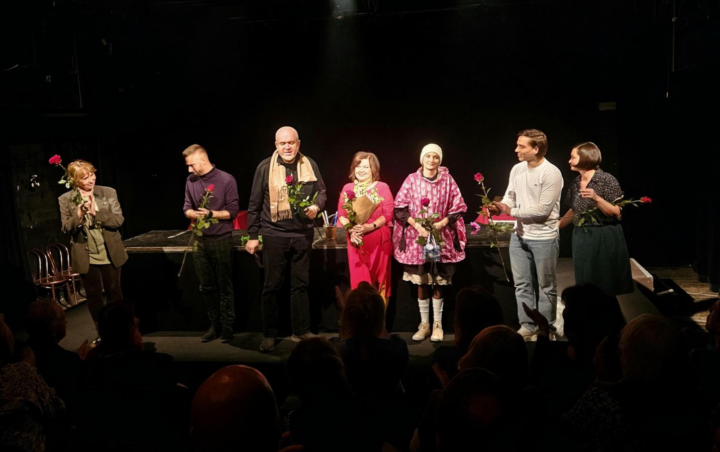 Romana Chvalová, dramaturg INprojektu Ladislav Nunvář, Viliam Klimáček, Ludmila Mecerodová, Karolína Šafránková, režisér Kostiantyn Zhyrov a dramaturgyně VČD Anna Zindulková Hlaváčková na děkovačce po premiéře, foto Barbora Secká