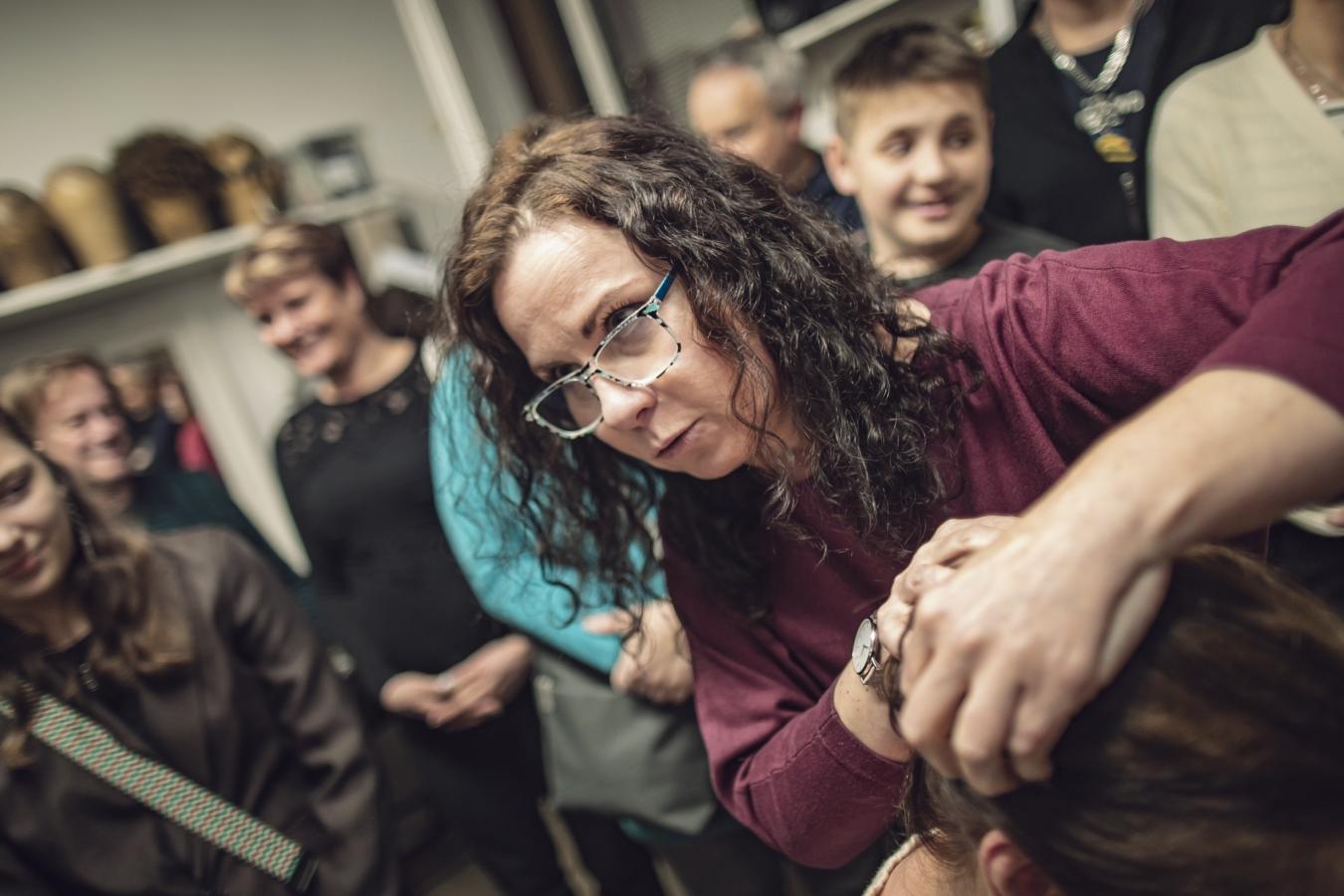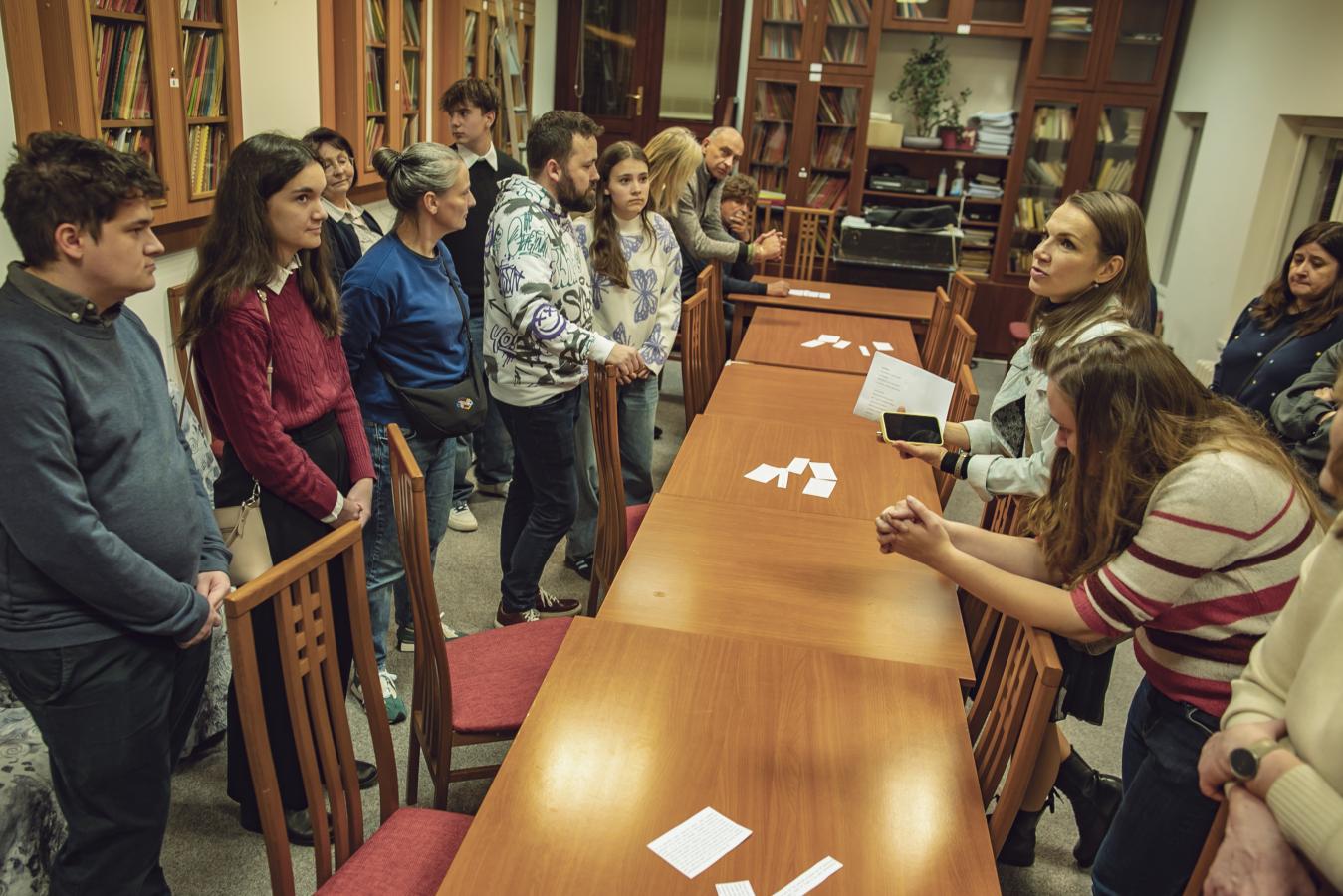 V podkrovní divadelní zkušebně diváci skládali za pomoci Martiny Sikorové rozstříhaný text jednoho z monologů ze Zahradní slavnosti Václava Havla, foto Jiří Sejkora
