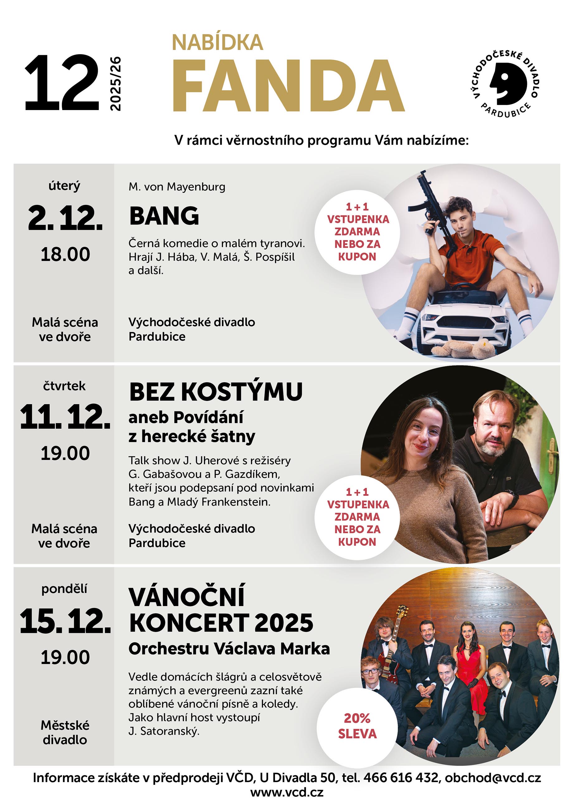 - slevu je možné uplatnit na nákup max. 2 vstupenek na představení (program FANDA se nevztahuje na představení v rámci pronájmů a zadaná představení), vstupenky lze zakoupit v předprodeji VČD, ve večerní pokladně nebo on-line; sleva se nevztahuje na předplatné